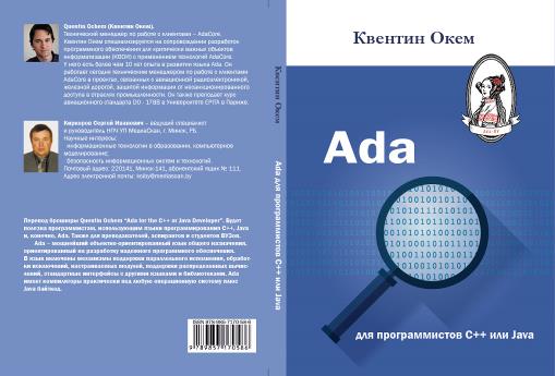 Окем, К. Ada для программистов C++ или Java / Квентин Окем ; перевод с англ. и комментарии С. И. Киркорова.— Минск : Колорград, 2017.— 170 с. Издание доступно в магазине «Академическая книга» http://www.akademkniga.by/publishers/62/ Перевод брошюры Quentin Ochem “Ada for the C++ or